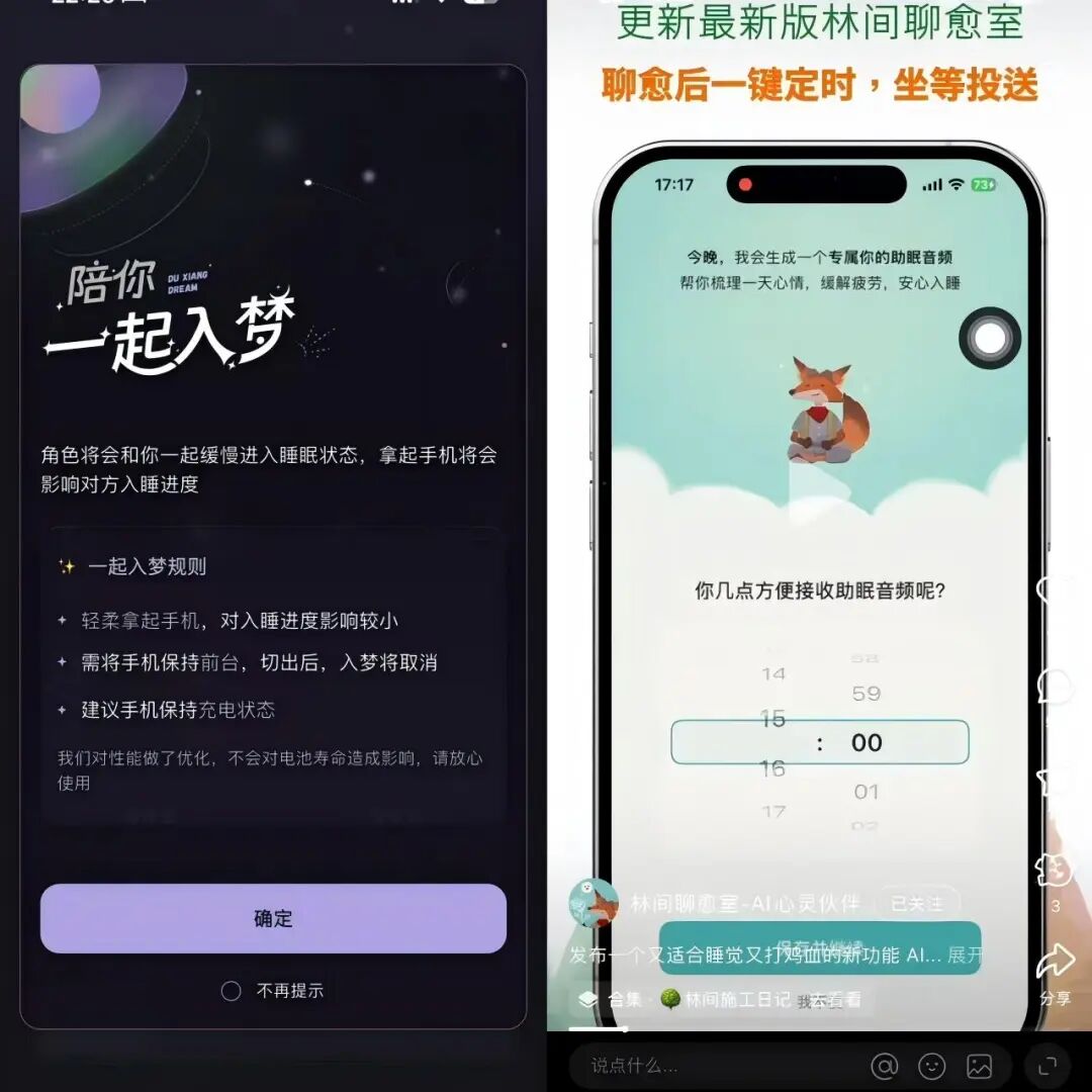 3、虚实结合。实现真人社交和AI社交的融合,如「Tolan」就引入了好友机制,用户互加好友后,可以访问对方的星球,尝试让虚拟陪伴成为真实社交关系网络的一环。除此以外,包括「独响」的「一起入梦」功能、「林间疗愈室」的「早晚安助眠音频」,这些小功能的创新都是为了实现用户的长期留存。