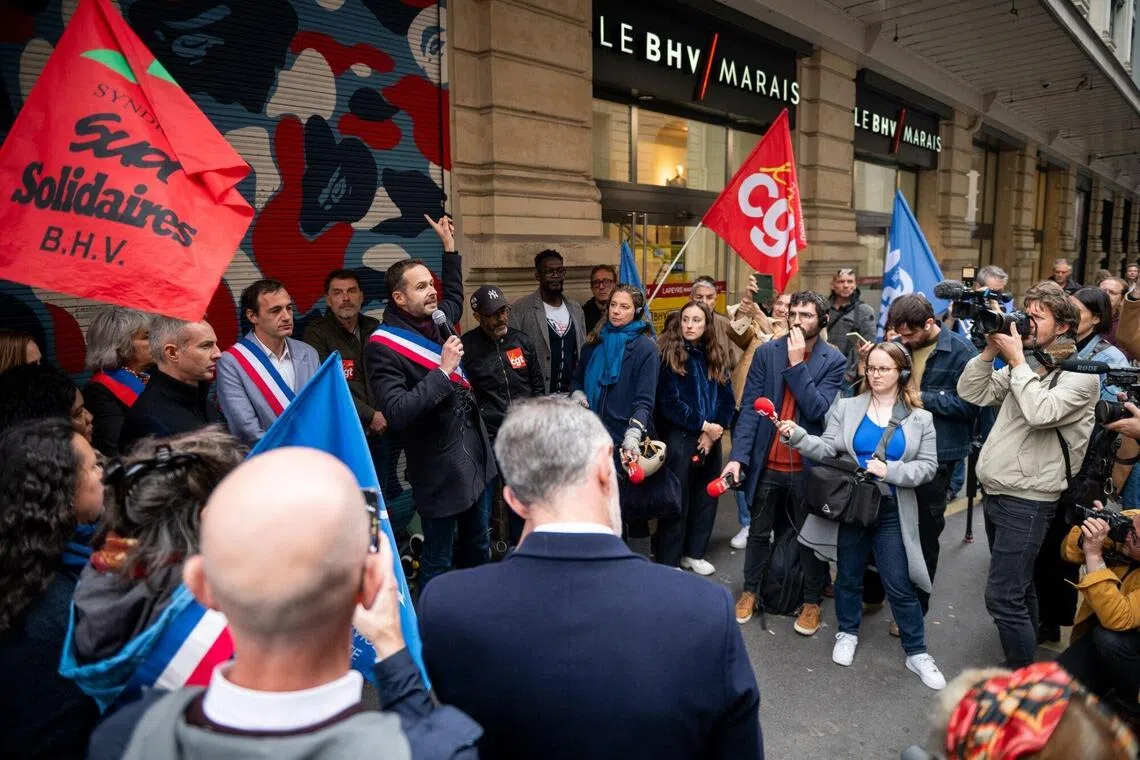 工会会员和员工和当地时间星期五(10月10日)在由法国百货商场业主Société des Grands Magasins(SGM)经营、位于巴黎市中心的BHV巴诗威百货商场外罢工抗议。 (彭博社)巴黎BHV巴诗威百货商场的员工当地时间星期五(10月10日)在商场外罢工抗议,商场管理层与中国快时尚电商巨头希音达成协议,让该公司永久进驻商场七楼。
