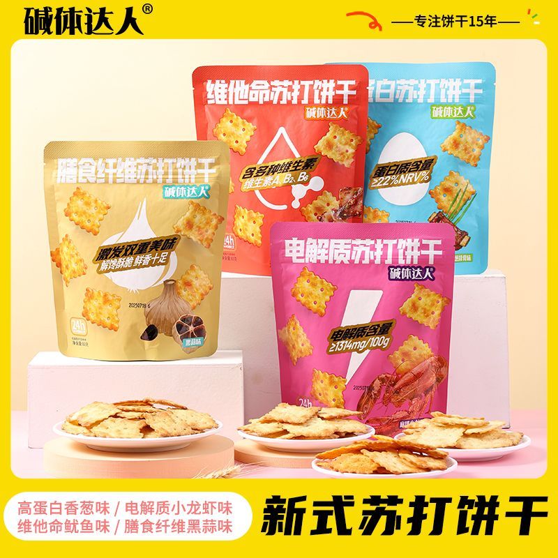 碱体达人苏打饼干80g共4包,黑蒜香葱麻辣小龙虾鱿鱼味咸味休闲零食小吃,一口酥脆唤醒儿时记忆,多种独特风味层层碰撞,咸香可口越嚼越香,独立小包装方便携带随时随地享受美味。