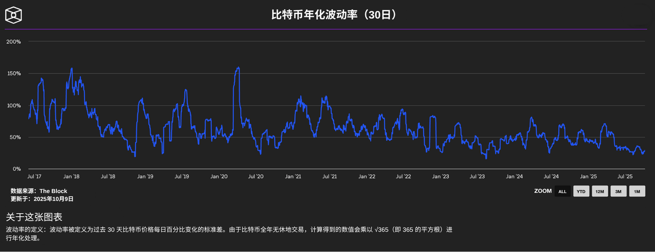 最近比特币涨得多,但是从历史上看,比特币波动率是非常非常大的。从 2010 年 8 月份首次开始有比特币的市场价格记录开始,到 2025 年大概 15 年期间,比特币的年化波动率大概是 76.9%。对比一般货币的波动率来说,比如美元、欧元,年化波动率一般来讲是低于 10% 的,很多年头是低于 5% 的,所以说比特币的波动率是现在主体经济用的法定货币的 10 倍以上。