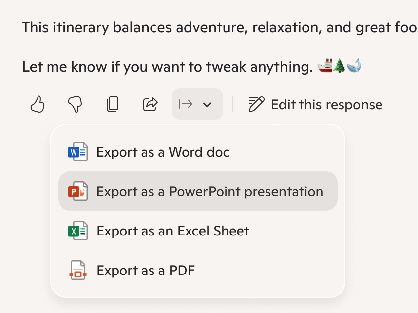 第二項新增功能是新建立和匯出文件、試算表、PDF或PowerPoint簡報檔。用戶可以自然語言下達提示讓Copilot執行任務,例如「將這段文字以Word文件匯出」或是「將這個表格轉成Excel檔」,Copilot會生成可編輯且可分享的文件。而且,回應若超過600字元,Copilot會生成預設的匯出鍵,讓用戶可直接將文字送到Word、PowerPoint、Excel或PDF應用程式。