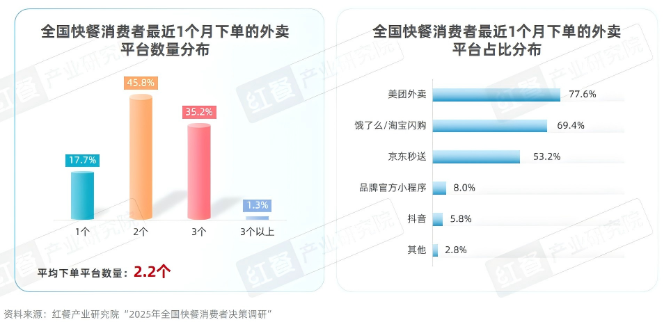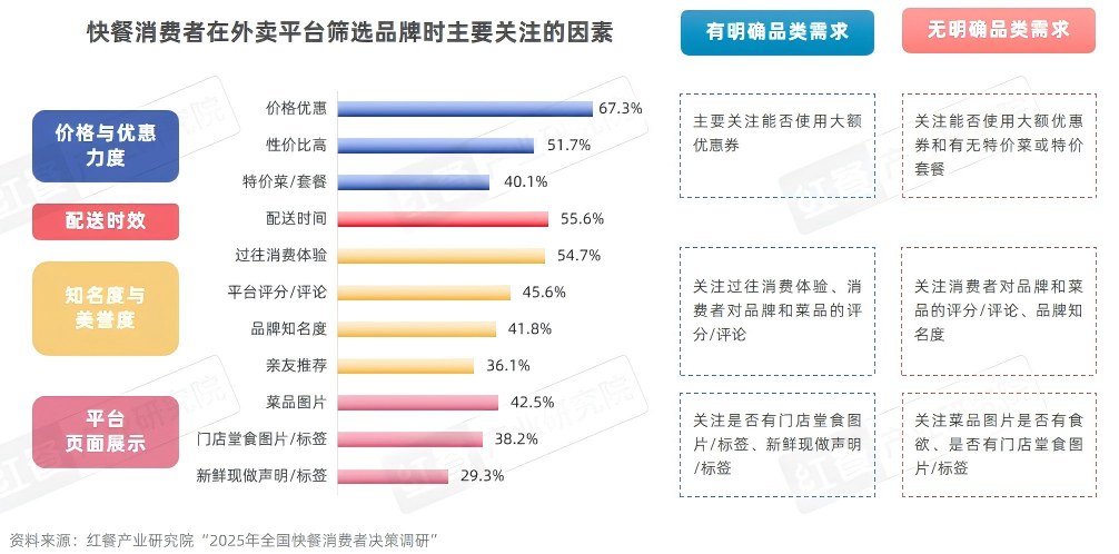 实际上,在线上外卖消费场景中,消费者对平台的忠诚度普遍较低,多数消费者倾向于通过多平台对比信息(如商家、菜品、价格、配送费及配送时效等)来优化选择,其中价格是核心关注点。红餐产业研究院“2025年全国快餐消费者决策调研”显示,91.3%的快餐消费者在点外卖时出现了“多平台跳转”行为;82.3%的快餐消费者最近1个月在两个及以上外卖平台上下单了外卖。
