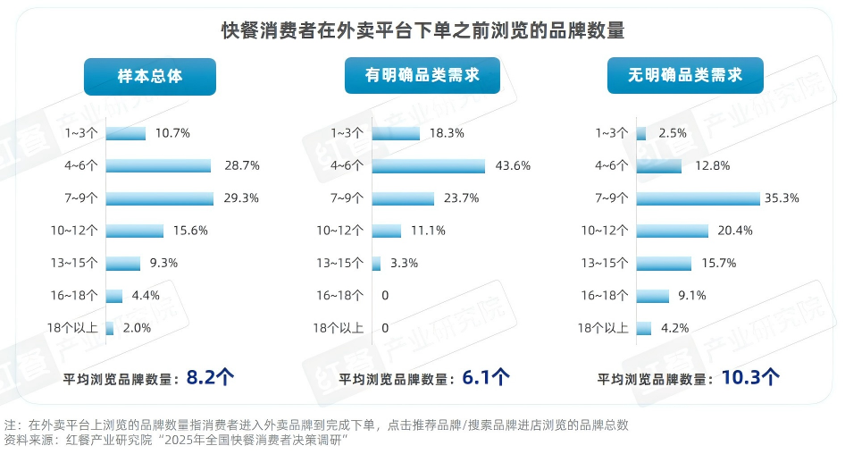 快餐消费者在进入外卖平台之后,普遍通过多品牌信息浏览进行决策匹配。据红餐产业研究院“2025年全国快餐消费者决策调研”,从进入外卖平台到完成下单,快餐消费者平均会浏览8.2个品牌,其中,无明确品类需求的消费者的平均浏览品牌数量更多,达到10.3个,而有明确品类需求消费者的平均浏览品牌数量仅为6.1个。