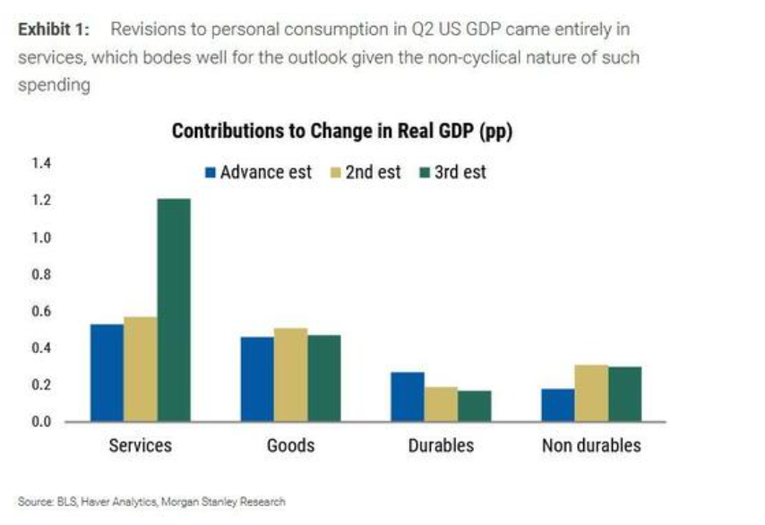 消费支出与AI投资展现韧性据摩根士丹利数据,经济增长最终取决于支出,而最新的支出数据显示经济稳健甚至强劲。尽管二季度GDP数据相对陈旧,但显示家庭服务支出有所回升,根据现有数据,三季度消费支出增长接近3%。