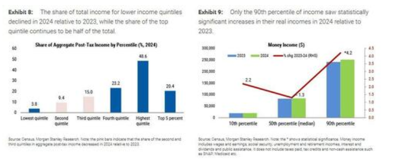 美国消费支出和AI资本支出表现强劲,三季度消费支出增长接近3%,高收入家庭财富大幅增长推动消费。然而,就业市场明显放缓,失业率上升,劳动收入增长停滞。摩根士丹利警告称,这种“精神分裂”的数据状况正在给资产定价带来重大挑战。