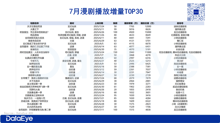 7月漫剧播放增量TOP30榜单中,《天才沦落捡药渣》登顶,《大雾之下》第二,《欧皇重生:荒古圣体签到就送?》第三。