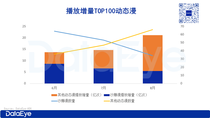 与之相对,其他类型动态漫逆势增长,8月播放增量达15.63亿次,是沙雕漫的近3倍,这一变化显示观众审美正从单一娱乐向多元题材延伸,也反映出行业从低成本试水向精品化创作转型的趋势。