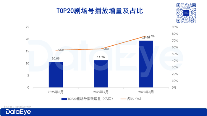 动态漫剧场号的流量集中度也在快速攀升。近3个月,TOP20剧场号的播放增量占比从56%升至77%。在刚过去的8月,近400个剧场号中,TOP20剧场号的播放增量达19.46亿次,占比达77%。