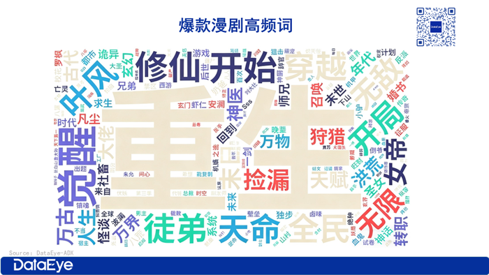 对近三个月播放增量TOP100的漫剧标题进行拆解后,高频热词包括重生、觉醒、修仙、天命、穿越、女帝等。从题材属性来看,这些高频热词均指向强冲突、高爽感的男频内容,与此前TOP30榜单中逆袭、玄幻仙侠题材的高热度形成呼应。