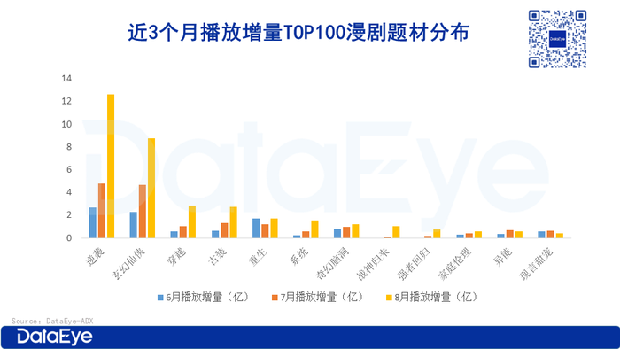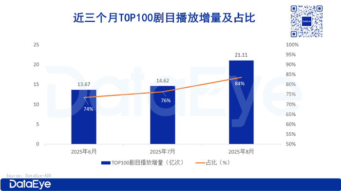 值得关注的是,动态漫剧播放量向头部高度集中。近3个月,TOP100漫剧贡献了绝大部分流量,且占比逐月攀升。以8月为例,当月TOP100漫剧播放增量达21.11亿次,占据大盘播放增量的八成以上。
