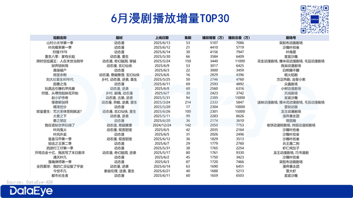 在6月漫剧播放增量TOP30榜单中,《山村小太爷第一季》登顶,《叶风概率第一季》与《狩猎1978》分别位列第二、三名,TOP3席位均被沙雕漫占据。TOP30中,新剧20部,老剧10部。