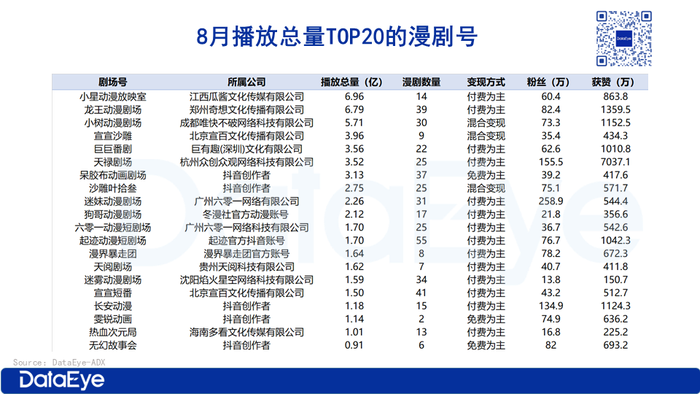 我们梳理了8月播放总量TOP20的漫剧号,发现: