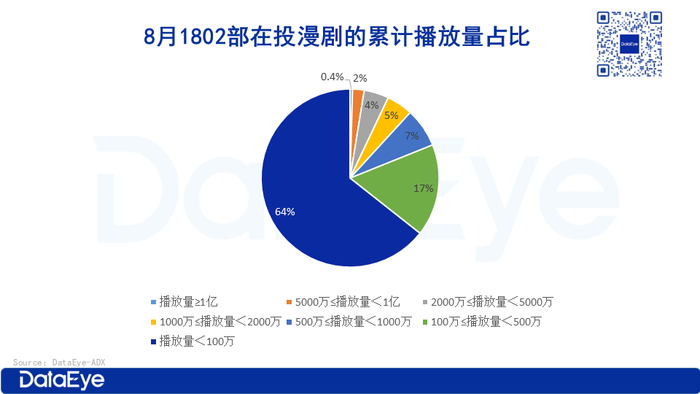 如果统计8月1802部在投漫剧的累计播放量,分化现象更为显著。具体来看,播放量破1亿的仅8部,占比0.4%;46部超5000万次(占比2.6%);213部超1000万次(占比12%);而64%的漫剧累计播放量不足100万。这意味着多数漫剧沦为“陪跑员”。