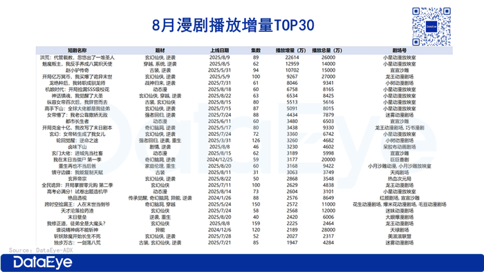需求侧同样表现强劲,动态漫剧播放增量同步持续增长。其中8月播放增量达25.24亿次,环比增长32%,播放总量已突破95亿次。