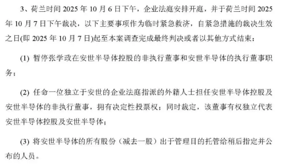 10月1日,荷兰企业法庭应安世半导体外籍高管请求,法庭生效临时措施:
