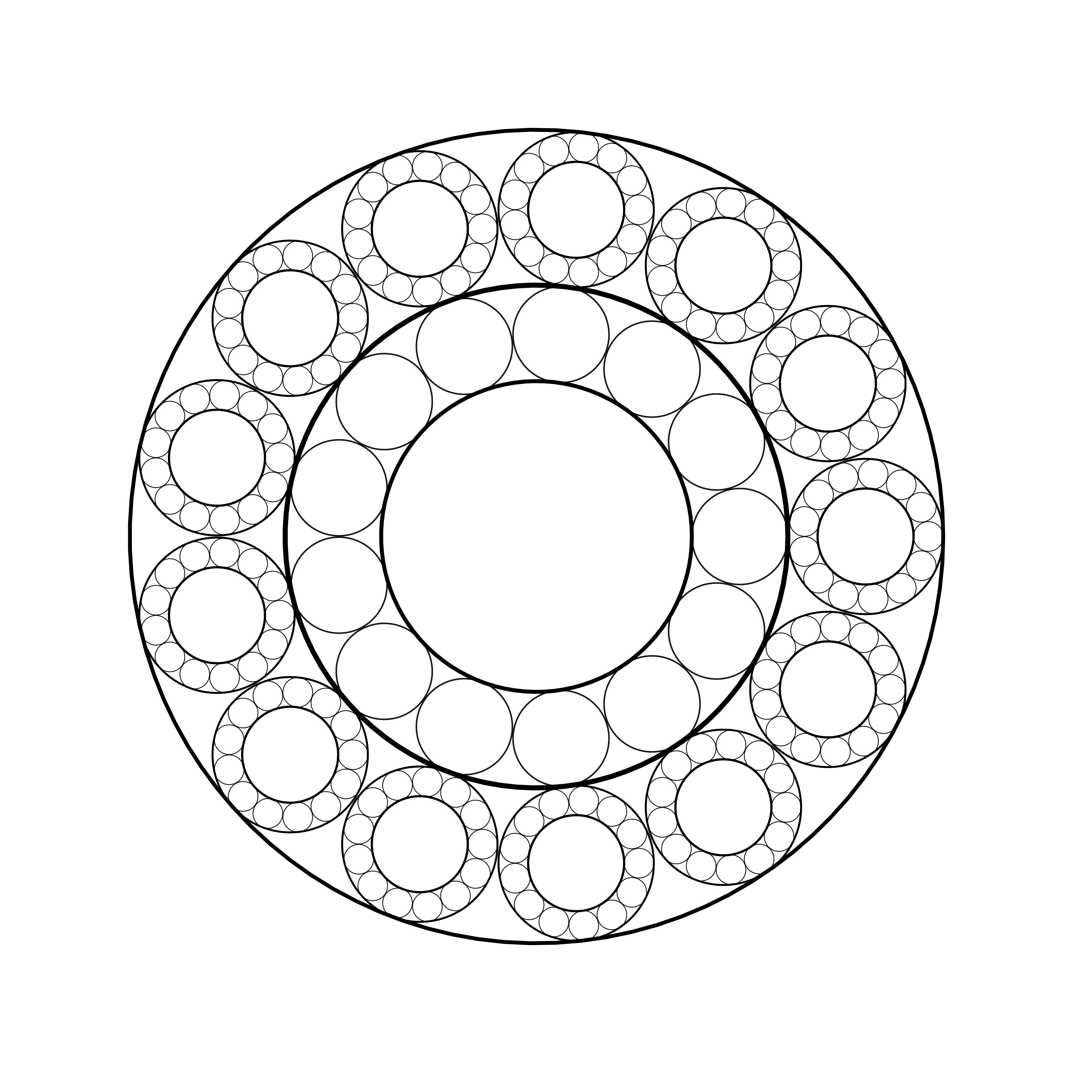 Outer radius:R=1Inner radius:rsmall=1Φ=Φ−1=√5−12Ring radius:rring=R−rsmall2=1−(Φ−1)2=2−Φ2=2−1+√522=3−√54Centers radius:rc=rsmall+rring=√5−12+3−√54=2(√5−1)+(3−√5)4=√5+14=Φ2Chord distance:d=2rcsin(π/13)=Φsin(π/13)Tangency requires:d?=2rringΦsin(π/13)?=3−√52sin(π/13)?=3−√52Φ=3−√51+√5=(3−√5)(1−√5)(1+√5)(1−√5)=3−3√5−√5+5−4=8−4√5−4=√5−2Numerical:sin(π/13)≈0.23932√5−2≈0.23607Difference:≈0.00325(numerical gap)
