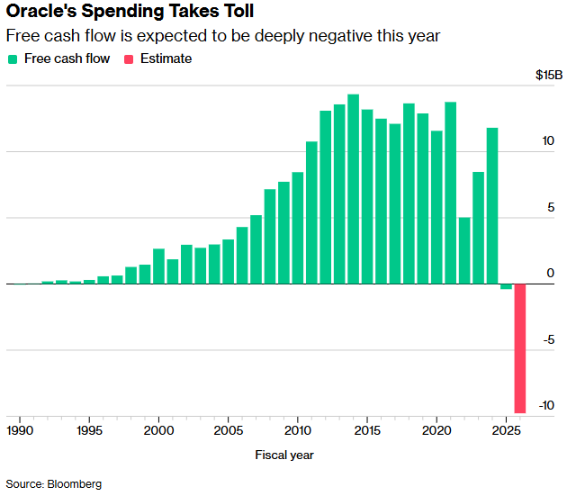除了利润率之外,投资者还担心扩大甲骨文云计算能力所需的支出。截至今年5月的2026财年,甲骨文的资本支出预计将达到354亿美元,较上年增长67%。因此,自由现金流继去年自1990年以来首次出现亏损后,预计今年将出现98亿美元的负现金流。