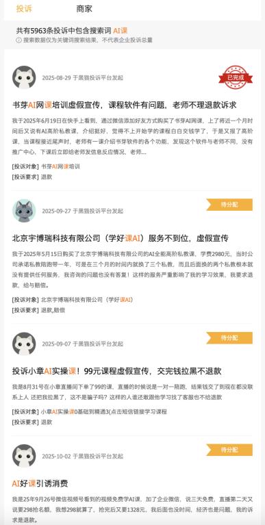 截止10月13日,在黑猫投诉平台搜索“AI课”,相关结果高达5963条,其中涉及老年学员的不在少数,投诉问题涵盖夸大宣传、诱导消费、效果与承诺背离、退费难等。