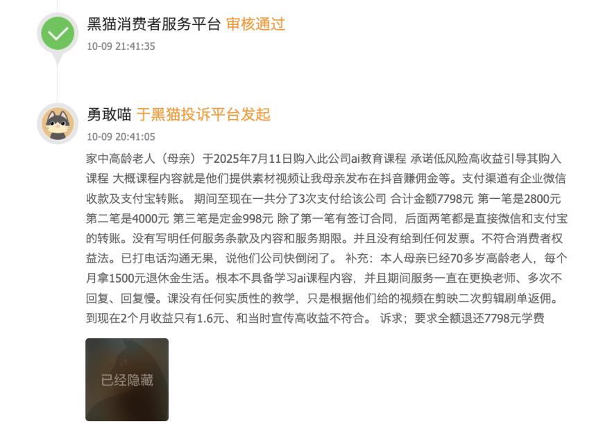 一位投诉者称,家中70多岁的老母亲并不具备学习AI知识的能力,却被平台承诺的“低风险高收益”诱导购入其AI课程,前后缴纳培训费累计达7798元。不仅课程没有任何实质性的教学,他们根据所报AI培训课程操作2个月,收益也只有1.6元,与宣传严重不符。