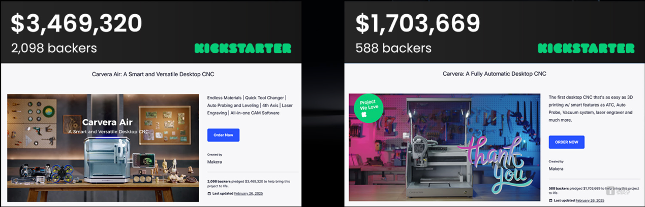 造物时代相继推出两款旗舰产品Carvera智能桌面CNC雕刻机、Carvera Air智能CNC设备,这两款产品居于全球最大众筹平台Kickstarter的CNC品类历史最高众筹金额前两位,并凭借多项创新技术在专业创客群体中建立了“高精度、易操作、多功能”的品牌认知,成为桌面级精密加工领域的标杆产品。