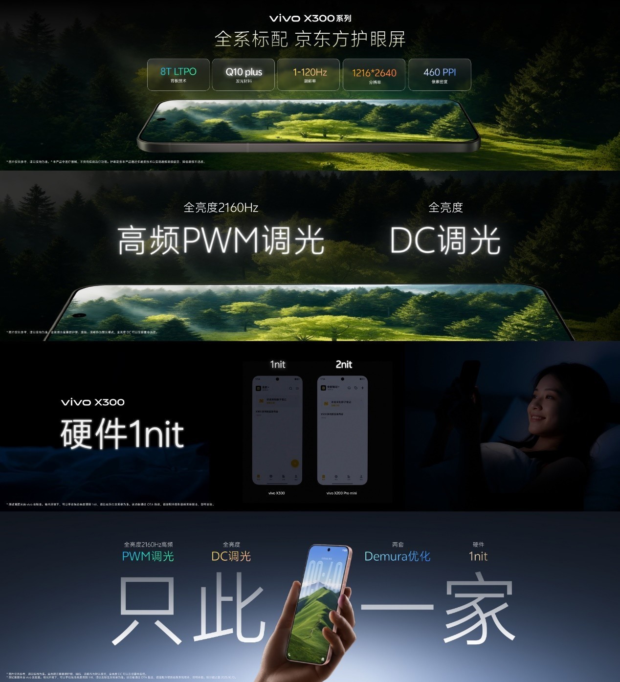 💡 **屏幕技术升级驱动旗舰体验:** BOE(京东方)为vivo X300系列全系搭载了由f-OLED技术赋能的全新Q10 plus护眼屏,集成了LTPO自适应刷新、硬件1nit低亮显示等行业领先技术。此次屏幕在亮度、色准、功耗与护眼方面实现了多维度的突破,为vivo X300系列提供了强大的“核心竞争力”,同时也代表着中国屏显技术的显著进步。