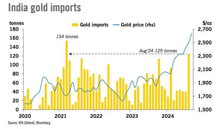 但印度的金铺们似乎并不遵循市场规律,9月份,印度的黄金的进口量,环比增长近100%,一个月时间买了大约120吨!