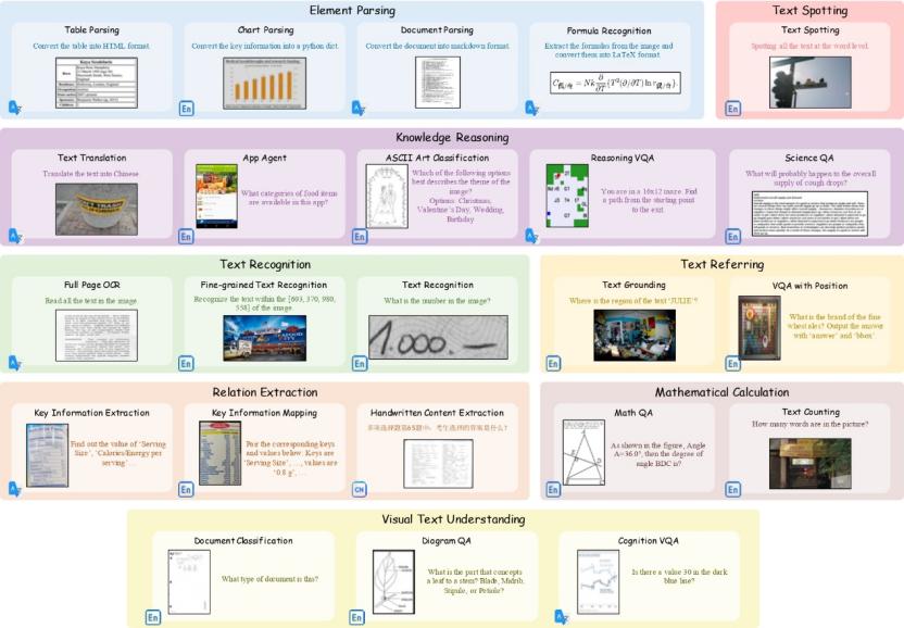 OCRBench v2 涵盖了 23 种细分任务,覆盖 8 大核心能力维度——文本识别、文本定位、文本检测识别、关系抽取、元素解析、数学计算、视觉文本理解和知识推理。