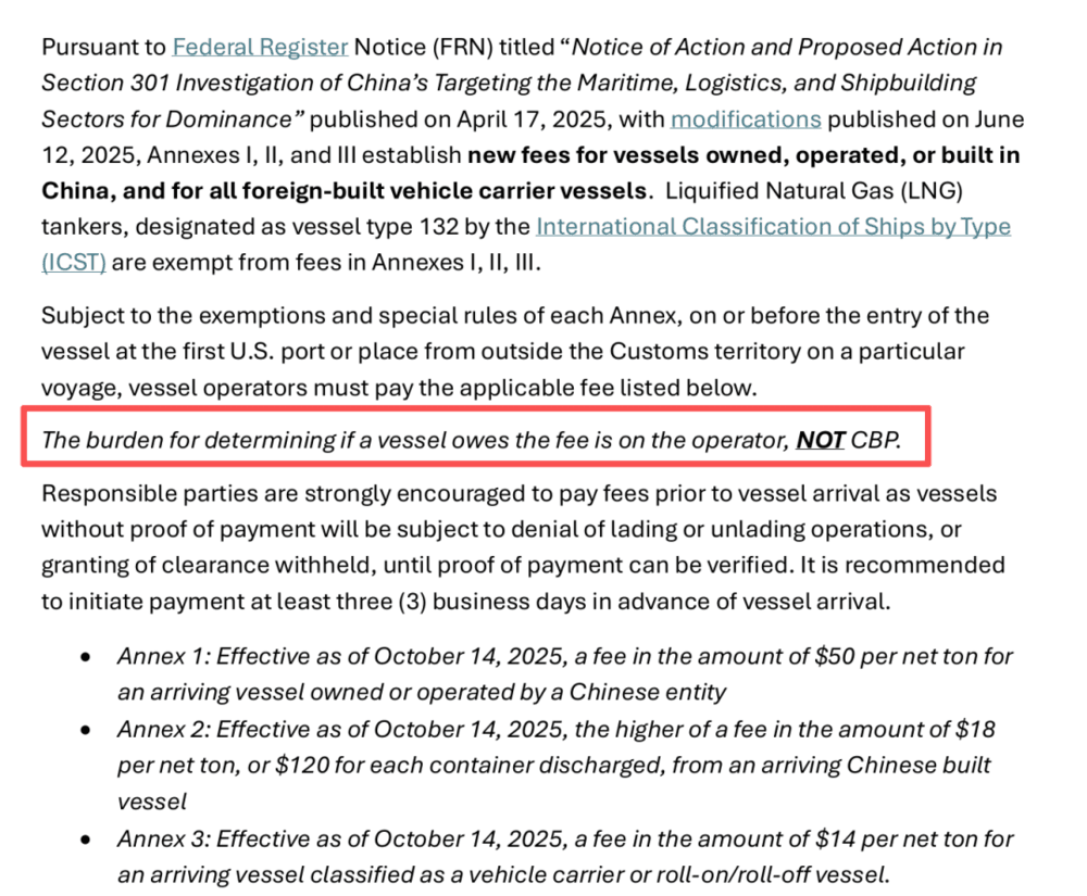 对中国运营、建造的船只歧视性收费、逐年涨价之外,还有一个恶毒的条款:船舶运营方自行判定是否落入收费范围,并承担缴费义务,美国海关只管收钱不做预审核。美国企图依靠“自我申报”配合“追溯追责”轻松管理,船公司需自行建档备查,CBP保留事后审计与罚款权力。