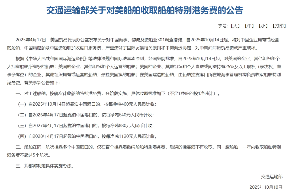 10月,中国交通运输部公布对美反制措施。可以看出,2025年10月14日开始征收港务费,2026、2027、2028年逐渐增加费用——都与美国政策对等。由于中美在海运与造船业的地位极不对称,如按身份对等反制,则只有美森轮船会受影响。