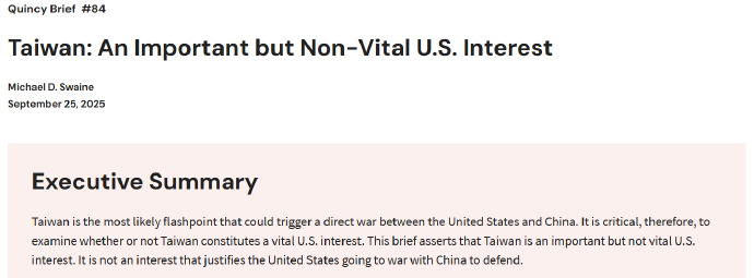 美国昆西研究所的高级研究员史文从军事与战略角度,进行了反思,认为台湾对美国没那么重要,放弃战略模糊,不要承诺战争。史文9月25日发了两份系列报告,《台湾是重要但非至关重要的利益》、《超越战略模糊:在不承诺战争的情况下支持台湾》。
