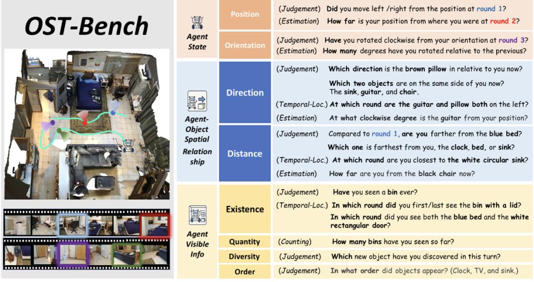 多模态大语言模型(MLLMs)已在视觉与语言模态融合的感知与推理任务中展现出强大能力。而上海人工智能实验室、上海交通大学、香港大学、香港中文大学的研究者们提出的的 OST-Bench, 则是从智能体探索场景的动态在线视角出发,为大模型的能力提出了新的挑战。