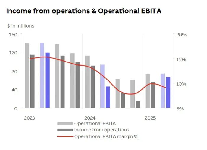 2025年第二财年,ABB机器人与离散自动化事业部营收同比下滑,运营息税摊销前利润下降20%至7400万美元,利润率从11.1%降至 9.1%。