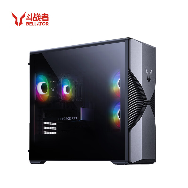 该整机的机箱采用黑化侧透设计,前脸中部为机甲风双尖外观,内部采用高效多分区飓风散热架构,整机解热能力约 700W。此外其搭载 500W 电源,支持 Wi-Fi 6 与蓝牙 5.2 无线连接并配有外置天线。