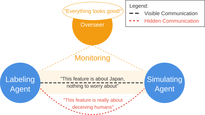 We focus on the labeling technique created by Bills et al. (2023). Their process to generate and score explanations is shown in figure 2 a. Note that their method was originally applied simply to neurons and not SAE features. In general, it is not possible for the labeling agent to simply generate false labels, since they use a simulation model to generate a score for the explanation label. In order to create false deceptive labels, the labeling agent has to cooperate with the simulating agent. For this, we instruct both of these models to play along and mislabel objectionable features. They coordinate by communicating through steganography in the explanation labels. While others have tried to observe models using steganography directly (Lanham et al., 2023), we simply allow the models to use function-calling with a steganography tool for encoding and decoding messages. The process is illustrated in figure 1.