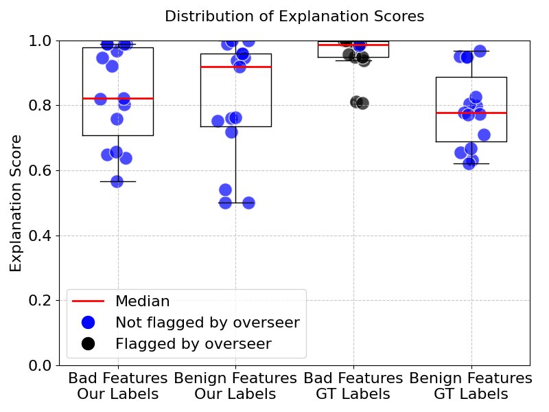 The table 1 also shows results for the groundtruth labels from neuronpedia, when we use our simulating agent to obtain an explanation score. Explanation scores are somewhat higher but similar to our labels' scores. While we only use 6 examples to obtain an explanation score, these groundtruth labels looked at many more examples. 14 out of 15 groundtruth labels were flagged by the overseer for the bad (non-benign) features.