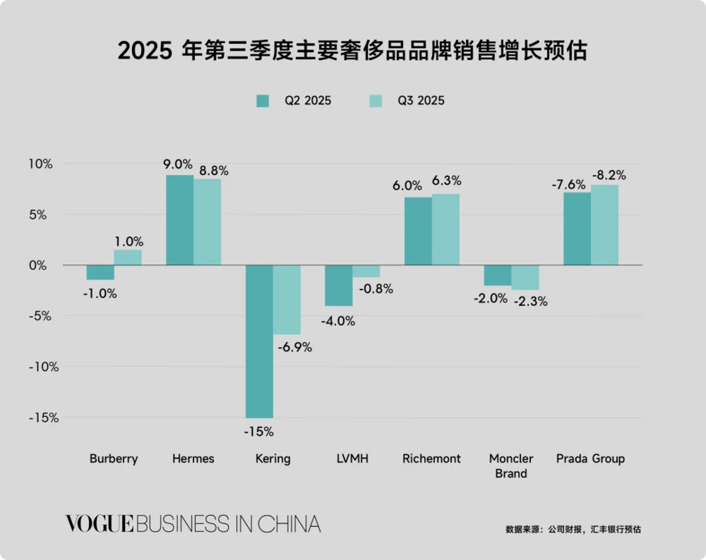 与此同时,爱马仕与历峰依然是 “金字塔尖” 的稳定者——汇丰预计二者第三季度分别增长 9% 与 6%。Scotti 认为:“爱马仕的增长仍由高端皮具驱动,而美妆与丝巾等可及品类略显承压。整体依旧是行业最稳的增长样本。”