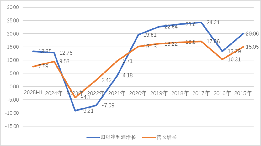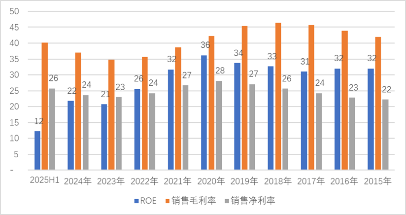 公司业绩从高速增长步入了平台期,2022年至2025年半年报其营收增长分别为2.42%、~4.1%、9.53%、7.59%,净利润增长分别为-7.09%、9.21%、12.75%、13.35%,年化净利润增长不足3%。与此同时,其ROE亦较前期大幅下滑,2022年至2025年半年报分别为26%、21%、22%、12%。