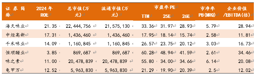 当前海天味业的PE为33.4倍,2024年ROE在22%左右,净利润增长率13.75%。其相对中炬高新及千禾味业,仍享有龙头溢价。