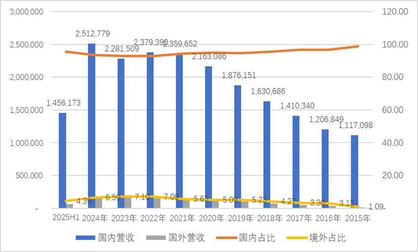 但是从数据来看,海天味业营收中95%左右来自境内,境外占比波动较大,近三年在6.5%~7%左右,但2025年上半年4.39%,较去年同期6.86%下滑2.47%。