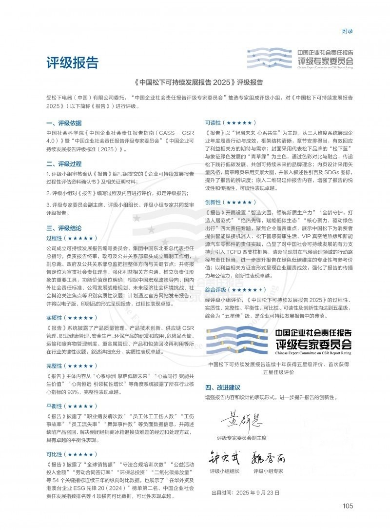 报告评级行动铸就未来。在可持续发展的新征程上,中国松下将以更大的决心、更强的韧性和更开阔的视野,深化创新、拓展合作,与社会各界一道,构建更加可持续的美好明天。