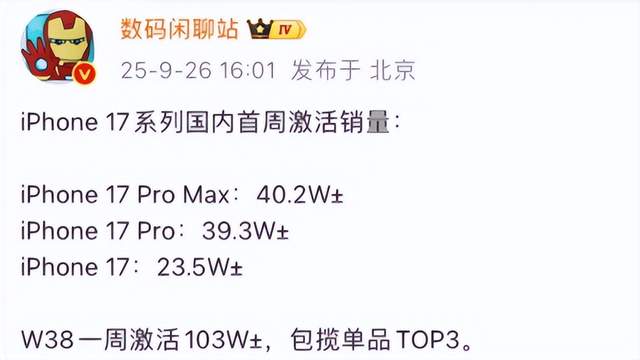 华为虽然在9月初发布了新款3折叠屏手机华为Mate XTs,一经上市便引发抢购,但随着苹果iPhone 17系列的超预期表现,直接抢走市场关注度。根据博主@数码闲聊站 爆料,iPhone 17系列国内首周激活量达到了约103万台,直接包揽了单品销量排行榜前三。