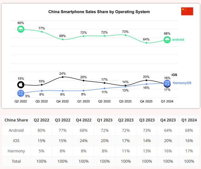 根据Counterpoint Research的研究报告,2024年一季度,鸿蒙以17%的市场份额首次超越苹果iOS。