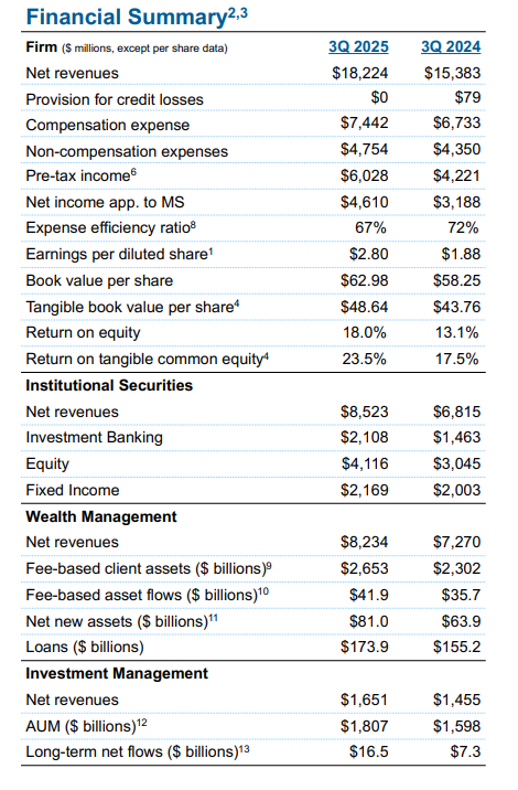 摩根士丹利 (MS.US) Q3财报交出了一份超预期的成绩单,净收入、每股收益、股本回报率三大核心指标均创同期纪录。