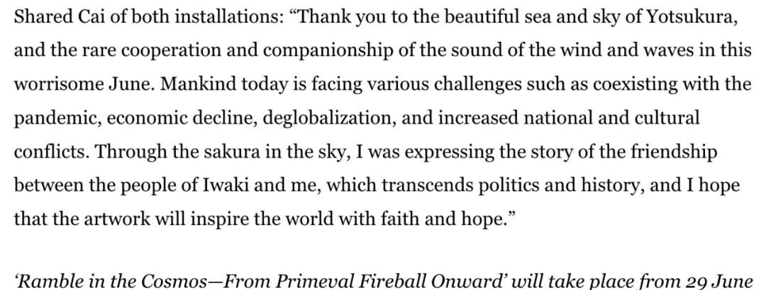 显然,这次活动没有让蔡国强团队对于“火药”这种爆破性质的,具有一定危险性的物质对公共利益的影响,进行更谨慎的评估。