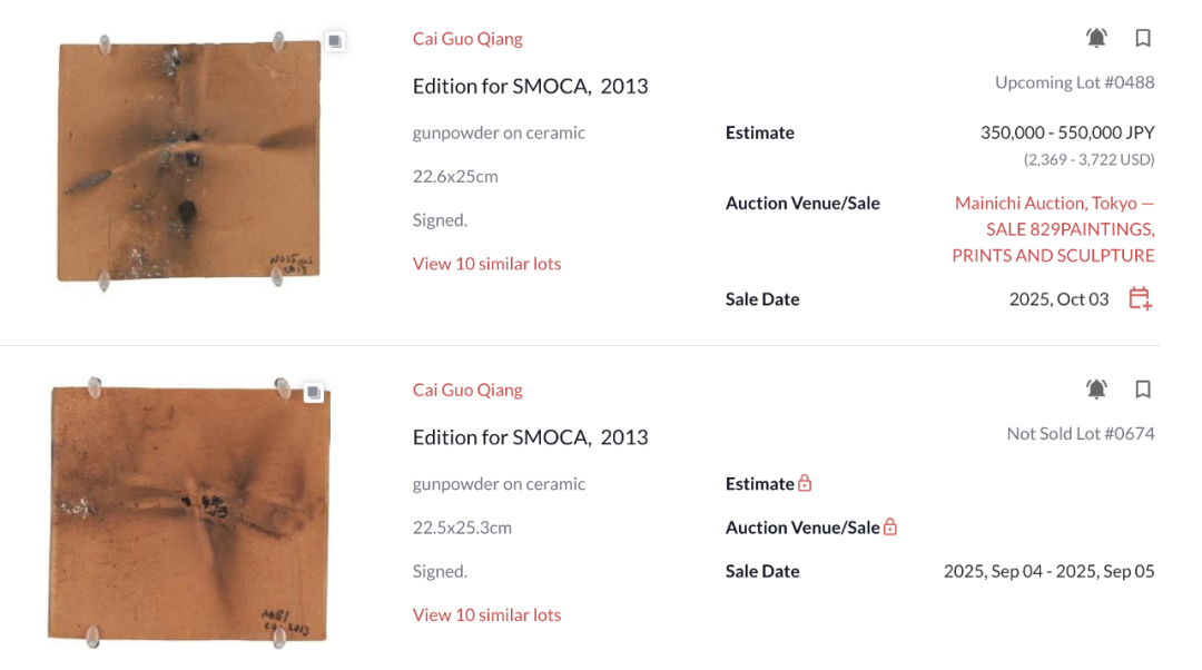 这些低于预估价格卖出,或者流派的作品,来自于2013年蔡国强为日本iwaki的美术馆Snake Museum of Contemporary Art的开幕式火药作品(即在陶瓦片terra cotta tile上点燃火药后的印记作为悬挂艺术作品)