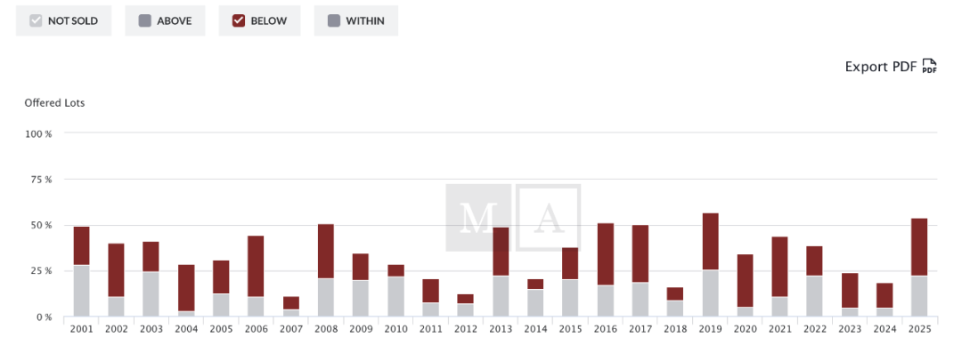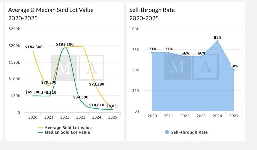 2025年的拍卖成功率从去年的百分之85跌到百分之50