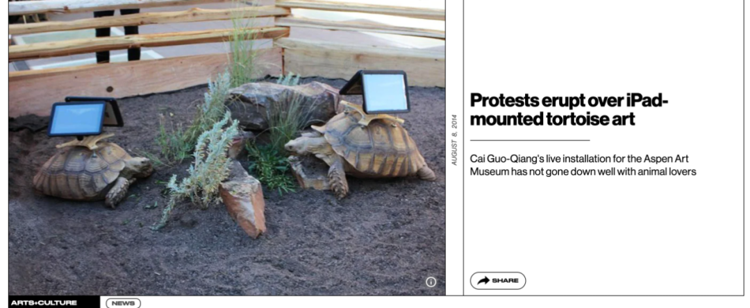 2013年,蔡国强在美国阿斯彭艺术博物馆的作品《移动鬼城》中,将iPad粘在苏卡达陆龟的龟背上,播放当地的“鬼城”影像。此举遭到大量动物保护和环保组织的强烈抗议。