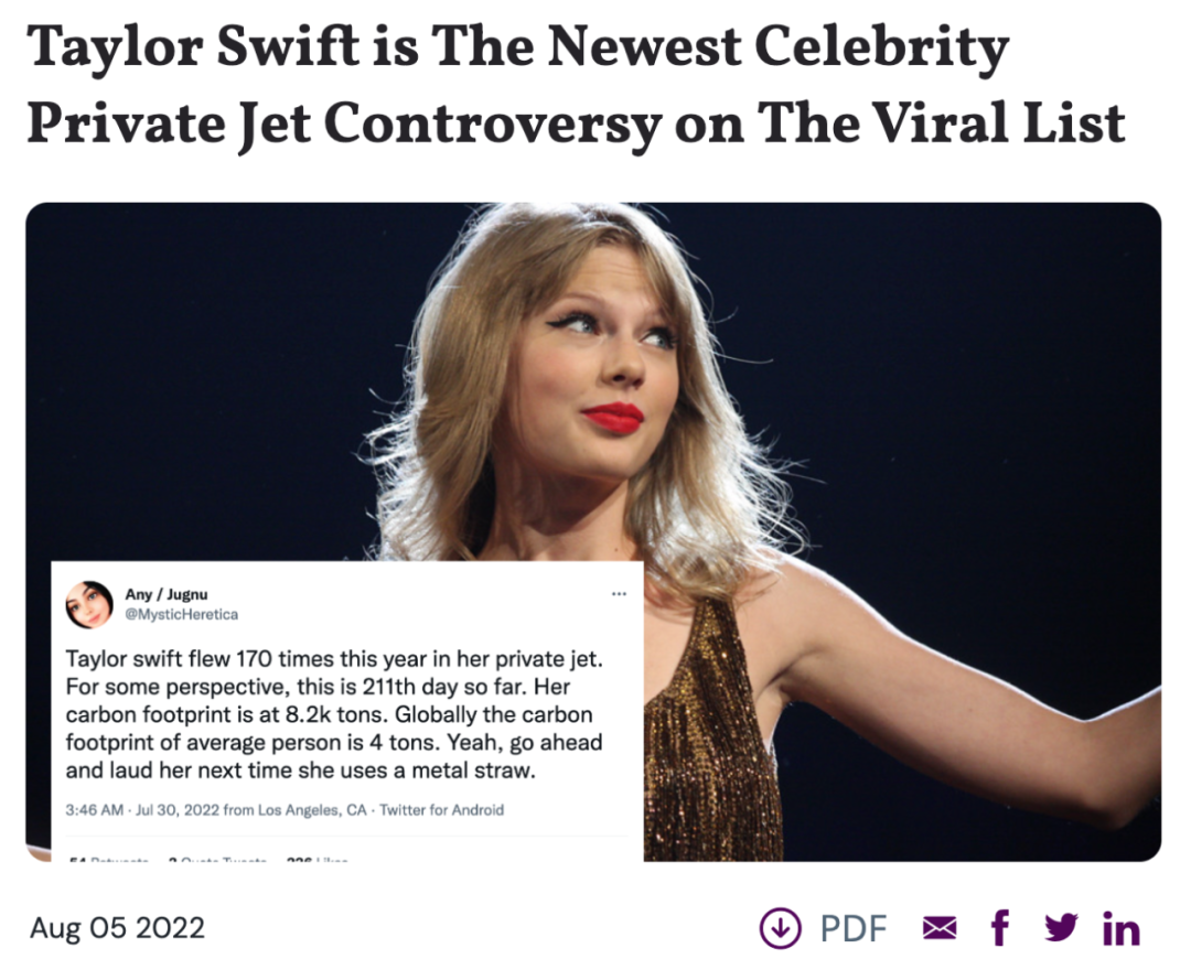 不得不说,对于环保这个社会议程,精英阶层作为日常用品的「私人飞机」,揭露了其虚伪的本质:精英可以言语上环保,行动上烧油,来获得大众的赞誉。正如图中的评论者所说:「她下次用金属吸管的时候还称赞她」吗?