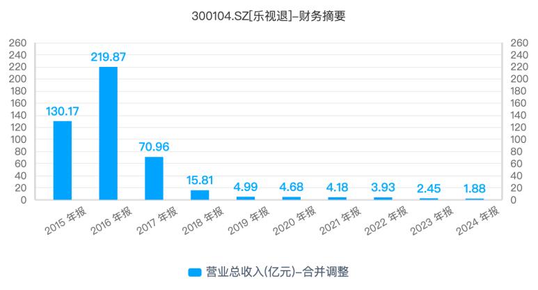 据同花顺iFinD数据,乐视网的业绩在2016年达到顶峰后,便开始持续“跳水”。到2024年,公司全年营收仅为1.88亿元,这一数字甚至不及巅峰时期的百分之一,昔日互联网巨头的光环已彻底褪色。