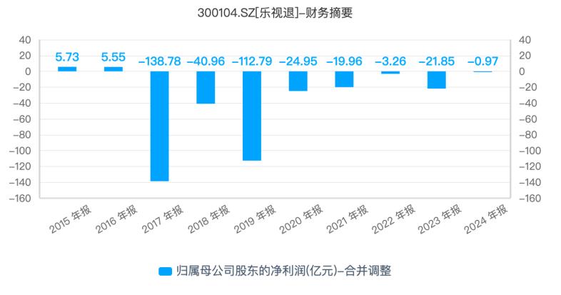 营收大幅缩水的同时,公司的盈利状况更是“雪上加霜”。2016年之后,乐视网的归母净利润已连续8年告负,累计亏损超360亿元,持续的失血让企业陷入难以逆转的经营困境。